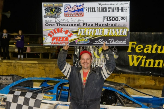 What won the race: Just two weeks after his son registered a career-first Mason-Dixon Shootout Series victory, Donnie Farlling of Newville, Pa., followed suit with a $1,500 triumph in Sunday night's 25-lap Steel Block Standoff at Bedford Speedway. The elder Farlling became the latest driver to join the Limited Late Model tour's winner's list after beating Clinton Hersh and his son, Taylor Farlling, to the finish line.