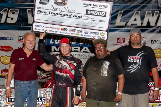 What won the race: Bobby Pierce of Oakwood, Ill., gained command for good on lap 29 after trading slide-jobs with Mitch McGrath and survived a late-race engine scare to register a $5,000 victory in Sunday night's inaugural Lucas Oil Midwest LateModel Association-sanctioned Scottie 45 at Quincy Raceway. The 22-year-old star pulled away from Will Vaught in the closing circuits to tally his fifth MLRA triumph of 2019.