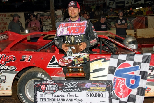 Overton collected his third WoO victory of the season, taking the checkers 1.601 seconds ahead of Madden, the Gray Court, S.C., driver who had won the previous night's WoO feature at Lavonia (Ga.) Speedway. Chase Junghans of Manhattan, Kan., was third with series points leader Brandon Sheppard of New Berlin, Ill., and Darrell Lanigan of Union, Ky., rounding out the top five.