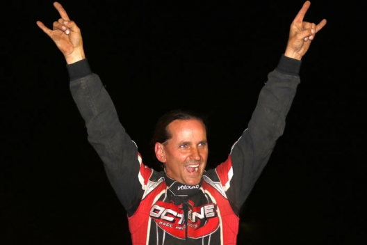 Freddie Carpenter celebrates his $5,000 victory at Atomic Speedway.