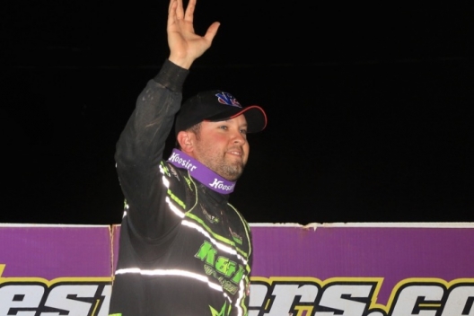 Chris Ferguson waves in victory lane at Screven Motor Speedway.