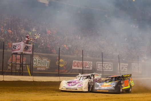 Surviving a wild race on a rugged surface, the 28-year-old Parkersburg, W.Va., driver barely held off Brandon Sheppard in the 40-lap finale for a career-high payday. With Sheppard’s Donny Schatz-owned car virtually shoving him across the finish line, Carpenter’s tattered car took the checkers by a 0.216-second margin on the temporary fifth-mile oval in a race where drivers wrecked, smoked or flipped their ways out of contention.