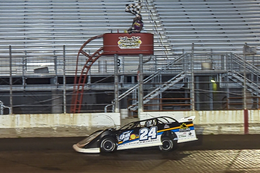 Bill Leighton Jr. takes the checkers at Crawford County Speedway.