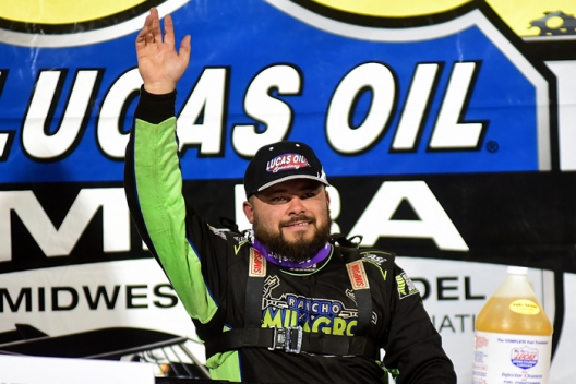 Johnny Scott waves from victory lane at Lucas Oil Speedway.