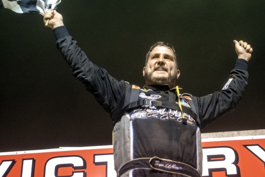 Ross White celebrates in victory lane at Volunteer Speedway.