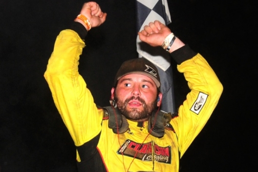 Devin Gilpin celebrates in victory lane at Brownstown Speedway.
