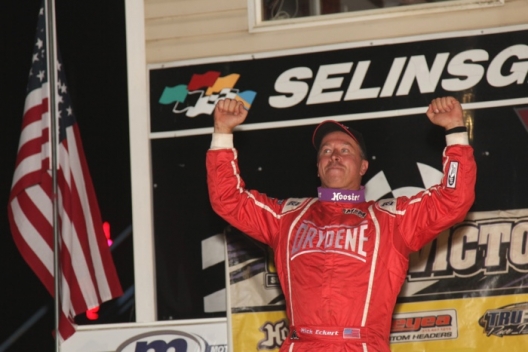 Rick Eckert celebrates his Ultimate Northeast victory at Selinsgrove Speedway.