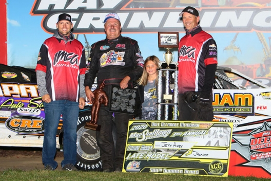 What won the race: Holding off the field after a caution flew with six-to-go, race-long pacesetter Jeff Aikey of Cedar Falls, Iowa, cruised to the Dale DeFrance Memorial victory Thursday at Marshalltown Speedway. Aikey earned $2,619 as — fittingly — inaugural tour champion and winningest series driver won the long-awaiting final race on IMCA's Deery Brothers Summer Series.