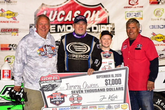 GREENWOOD, Neb. — Jimmy Owens won a $7,000 game of a Duck Duck Goose on Friday at I-80 Speedway on the Lucas Oil Late Model Dirt Series.