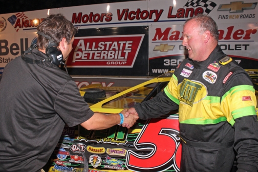 Jeff Wildung receives a congratulatory handshake in victory lane.