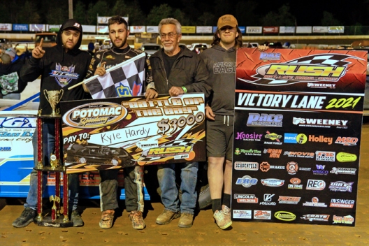 What won the race: Slipping by race-long leader Logan Roberson in turn three on the last lap, fourth-starting Kyle Hardy of Stephens City, Va., won Friday’s Pace Performance RUSH Battle of the Bay main event at Potomac Speedway. Hardy earned $3,000 second win in as many days with the series.
