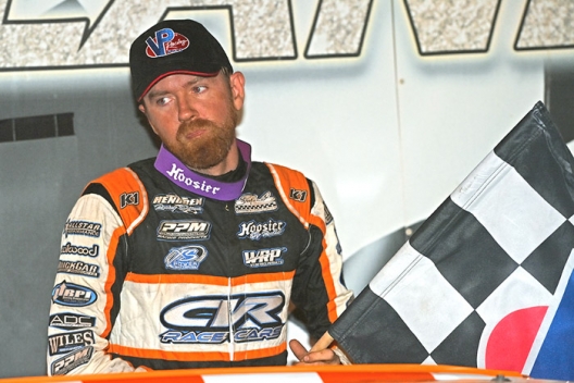 A subdued Matt Henderson in victory lane after an emotional triumph.