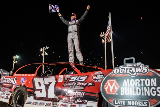 BOONE, Iowa (April 30) —Putting the frustrations of an up-and-down season behind him, Cade Dillard of Robeline, La., overtook race-long leader Brandon Sheppard of New Berlin, Ill., amid traffic on lap 19 in the first of two 25-lap Hawkeye 100 preliminary night features Friday night at Boone Speedway and pulled away to his first World of Outlaws Morton Buildings Late Model Series victory of the season.
