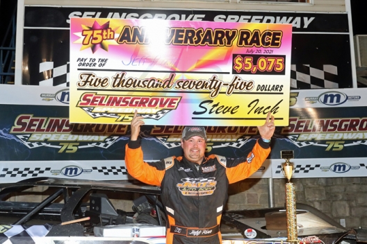 What won the race: Fifth-starting Jeff Rine of Danville, Pa., overtook race-long leader and polesitter Jim Bernheisel on the white-flag lap Tuesday and captured Selinsgrove Speedway's 75th Anniversary Race for a $5,075 payday. Rine swept around Bernheisel in turns three and four and pulled away on the final lap to win by 1.159 seconds.