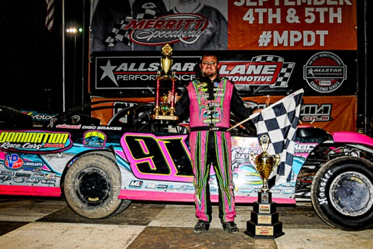 Rusty Schlenk picks up the hardware at Merritt Speedway.