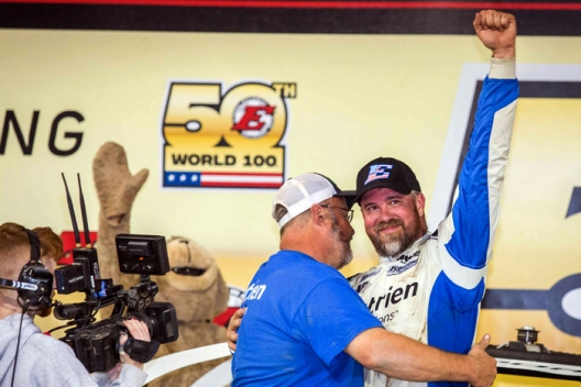 Crew chief Jason Durham embraces winner Jonathan Davenport.