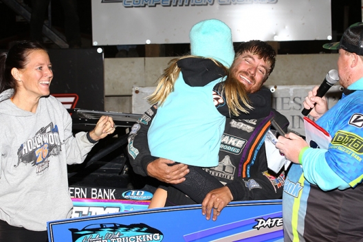 Jason Hahne celebrates with wife Kelani and daughter Ella in victory lane at Davenport.