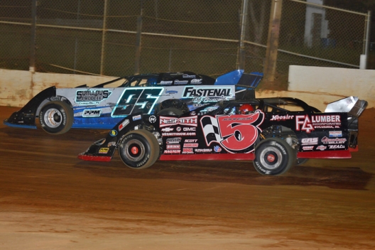 Ronnie Johnson (5) passed Brandon Williams (95) for the lead at 411 Motor Speedway.