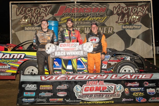 What won the race: Holding on after a pair of late cautions, Kyle Beard of Trumann, Ark., won Saturday’s Comp Cams Super Dirt Series main event at Jackson Motor Speedway. Beard earned $6,000 for winning the 10th annual All-American 60, his second career win in the event. Beard finished 1.085 seconds ahead of series leader B.J. Robinson.