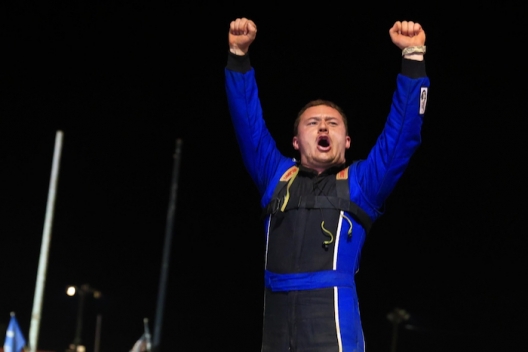 Daulton Wilson celebrates his $7,500 victory at Cherokee Speedway.