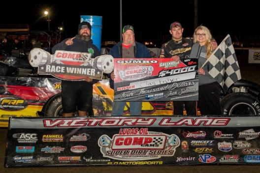 What won the race: Capitalizing when race-long leader Logan Martin cut down a tire with five laps remaining, polesitter Clay Fisher of DeWitt, Ark., earned $4,000 in a 30-lapper Friday at Greenville Speedway in the postponed Gumbo Nationals feature.Fisher grabbed his second career Comp Cams Super Dirt Series victory and first since 2015.