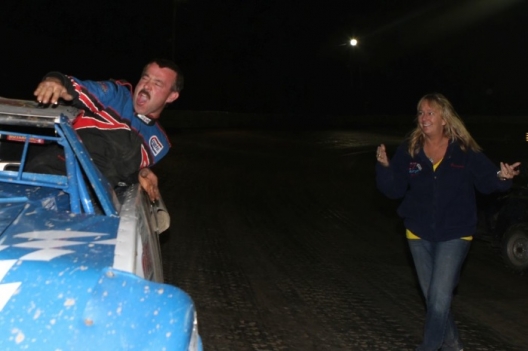 Roxanne Spangler welcomes her husband Eric to victory lane.