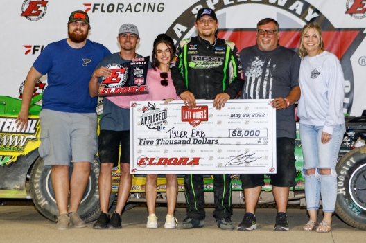 What won the race: Winning a survival-of-the-fittest battle in Eldora Speedway's Johnny Appleseed Classic on Sunday night, ninth-starting Tyler Erb of New Waverly, Texas, led the final 13 circuits of the 30-lap feature for a $5,000 payday in a race where multiple leaders fell by the wayside. Bobby Pierce blew a right-rear tire on lap 18, Kyle Bronson hit the wall on the 12th lap and Darrell Lanigan retired on lap seven after leading the first two laps in rugged conditions.