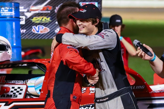Cade Dillard (left) congratulates winner Wil Herrington (right) at Magnolia Motor Speedway.