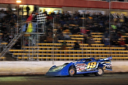 Ryan Gustin takes the checkers at Lakeside Speedway.