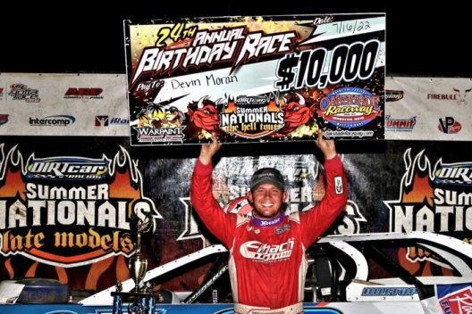 What won the race: Turning back repeated challenges from former track champ Rusty Schlenk, Devin Moran of Dresden, Ohio, earned $10,000 Saturday at Oakshade Raceway in the DIRTcar Summer Nationals-sanctioned Birthday Race. Moran took the checkers 0.975 of a second ahead of Schlenk, who briefly slipped by Moran with nine laps remaining before Moran's crossover move put him back up front. Moran led laps 10-40 on a track roughed up by rain the previous night.
