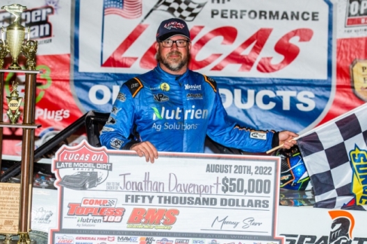 It’s Davenport’s third straight crown jewel victory in wire-to-wire fashion, off the strength of wins at the USA Nationals on Aug. 6 and North-South 100 on Aug. 13. That’s not to mention earlier crown jewel triumphs in the Eldora Million and Silver Dollar Nationals, as well as additional $50,000 paydays April 23 at Florida’s All-Tech Raceway and June 4 at West Virginia Motor Speedway.
