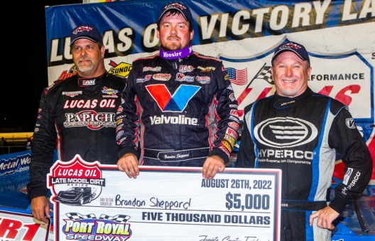 Brandon Sheppard of New Berlin, Ill., kept Jimmy Owens at bay early and turned back a challenge from Earl Pearson Jr. on the final restart for a clean sweep of Friday's Rumble by the River first preliminary program at Port Royal (Pa.) Speedway. After setting fast time by a wide margin and winning his heat, Sheppard led all 25 laps from the pole to put himself in prime position ahead of Saturday's $50,000-to-win finale.
