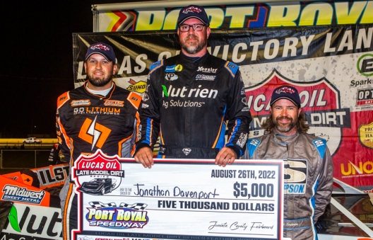 Jonathan Davenport of Blairsville, Ga., had the Midas touch once again Friday at Port Royal Speedway as the sport's dominant force prevailed in the Rumble by the River's second 25-lap semifeature with the Lucas Oil Late Model Dirt Series. Davenport overtook polesitter and race-long pacesetter Chris Ferguson with seven laps left and cruised to the finish 4.337 seconds better than the Mount Holly, N.C., driver.