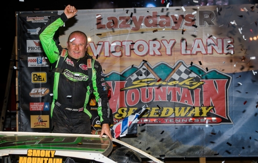 Jimmy Owens celebrates at at Smoky Mountain Speedway.