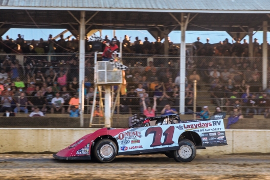 Hudson O'Neal takes the checkers for his 40-lap victory.