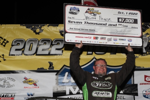 What won the race: Third-starting Jason Feger of Bloomington, Ill., led all 50 laps Saturday at Sycamore Speedway to capture the $7,000 Harvest Hustle weekend finale. Feger's victory is the first of his career with the Missouri-based Lucas Oil Midwest LateModel Racing Association.