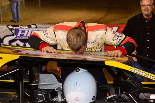Keith Jackson kisses the roof of the winning car at Hagerstown.