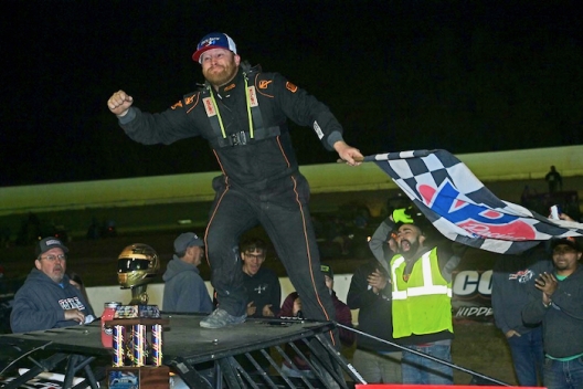 Joseph Joiner celebrates atop his winning car at All-Tech Raceway.