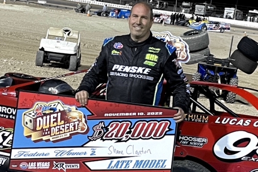 Notes: Clanton’s fourth XRSS win of 2022 came in his first-ever start at the Las Vegas oval. … Tanner English placed fourth in his debut driving for Viper Motorsports. … The checkered flag waved on the Late Model feature at 11:50 p.m. with three support division features remaining. ... The Duel in the Desert continues Friday with another $20,000-to-win event before concluding with Saturday's $40,000-to-win finale. … After failing the deck height rule multiple times in pre-race technical inspection, Brandon Overton of Evans, Ga., was allowed only one qualifying lap. ... Justin Duty of Molalla, Ore., suffered a flat right-front tire and failed to post a lap in qualifying.