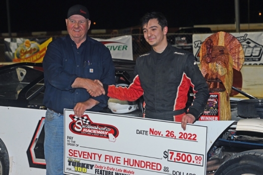 What won the race: Taking the lead on lap six John Ruggiero Jr. of Lincolnton, N.C., led the rest of the way to win Saturday's $7,500 22nd annual Turkey 100 feature at Swainsboro Raceway. Ruggiero Jr. also won Friday's $3,000 opener, giving him the weekend sweep and over $10,000 in total winnings along with his 17th feature victory of the year.