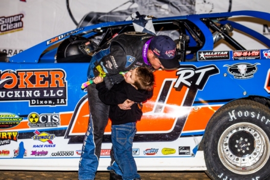 Ricky Thornton Jr. gets a hug from his son in All-Tech's victory lane.
