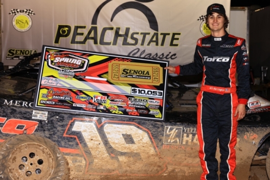 What won the race: Wil Herrington of Hawkinsville, Ga., took the lead for good on a lap-15 restart and paced the remaining circuits to capture Saturday night's 35-lap Schaeffer's Oil Spring Nationals feature at Senoia Raceway. He survived rugged track conditions to earn $10,053 for first career tour victory.