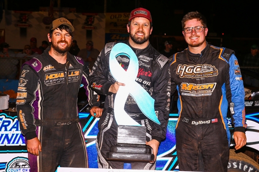 Winner Chris Ferguson (middle) in victory lane with runner-up and cousin Carson Ferguson (right) and third-finishing Caleb Gay (left).