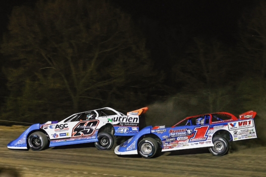 Hudson O'Neal (1) noses in on Jonathan Davenport (49) en route to winning Thursday's $12,000 feature at Atomic Speedway.