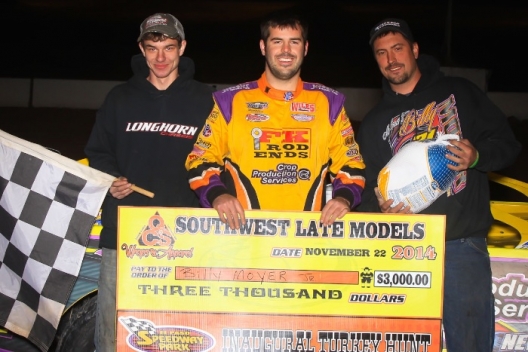 What won the race: Billy Moyer Jr. of Batesville, Ark., led all 30 laps, fighting back challenges from Rodney Sanders of Happy, Texas, for a $3,000 triumph at El Paso Speedway Park. With Friday's $2,500 victory, Moyer swept the inaugural Turkey Hunt weekend.
