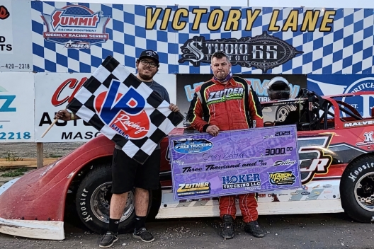 Cory Zeitner in victory lane at Mason City Motor Speedway.