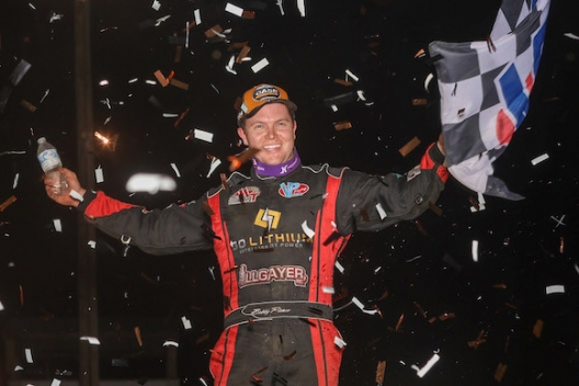 Bobby Pierce celebrates a $10,000 World of Outlaws victory at Farmer City.