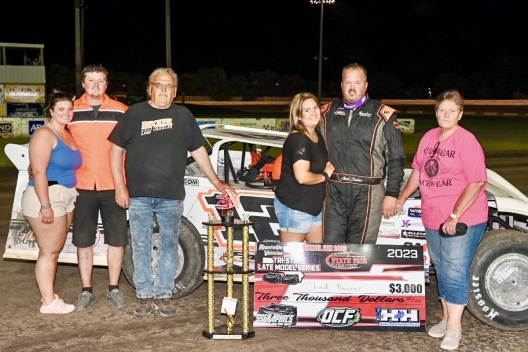 Chad Becker poses with family and team after winning Thursday's Tri-State Series feature at Huron.