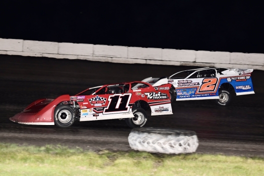 Pat Doar (11) races by Dave Mass (2) to win Friday's WISSOTA Challenge feature, collecting his third straight series victory.