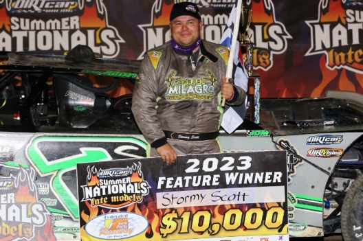 Stealing the lead exiting turn four on the final lap, Stormy Scott of Las Cruces, N.C., earned $10,000 Saturday at Federated Auto Parts Raceway at I-55 for his first career DIRTcar Summer Nationals victory. The low-running Scott went from third to first on the final lap and edged Winger by 0.224 of a second at the third-mile oval while Drake Troutman was third.